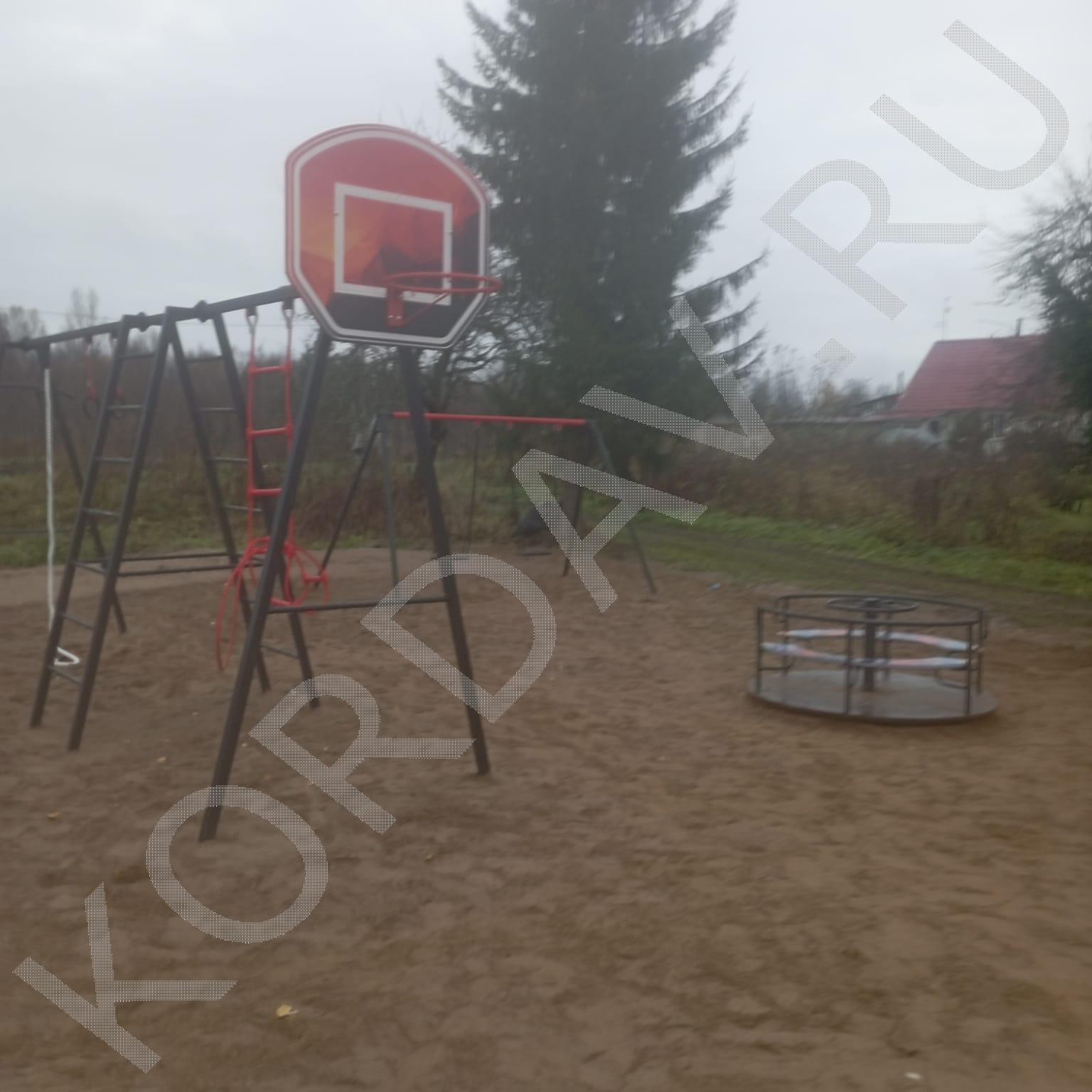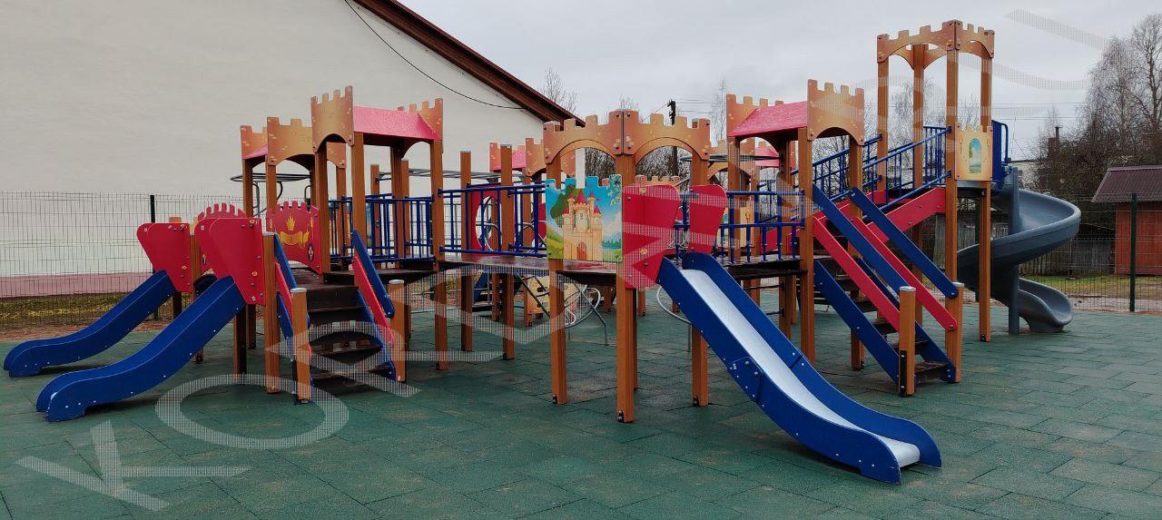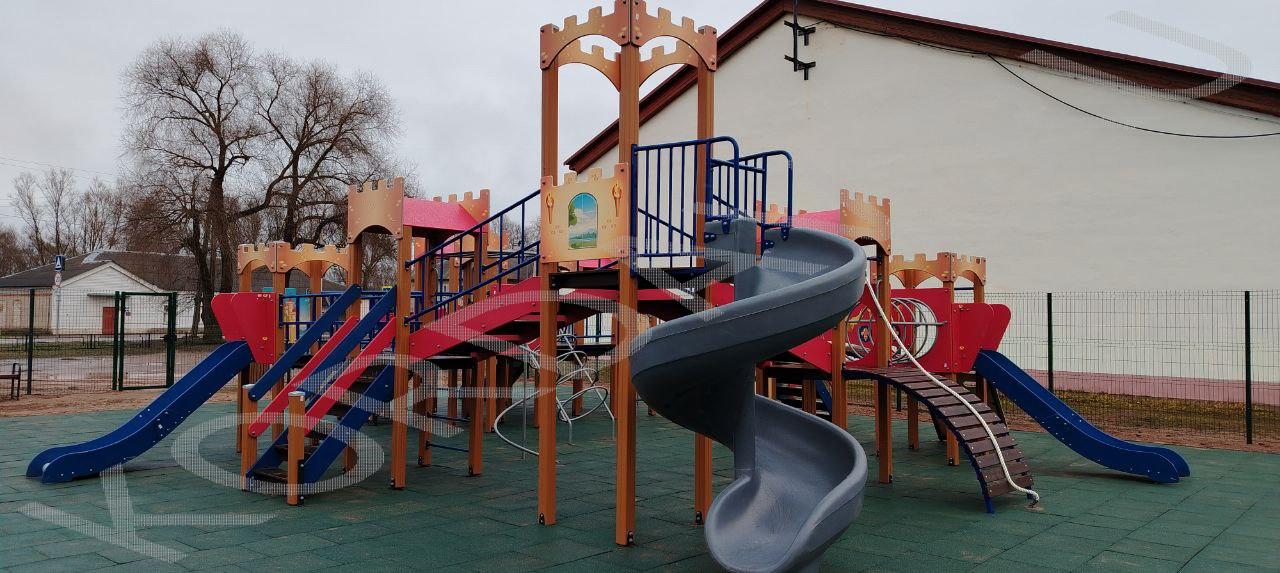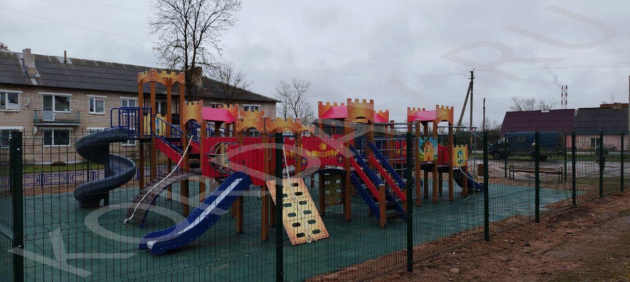 Детская площадка с резиновой плиткой и металлическим ограждением. Использовалось оборудование: